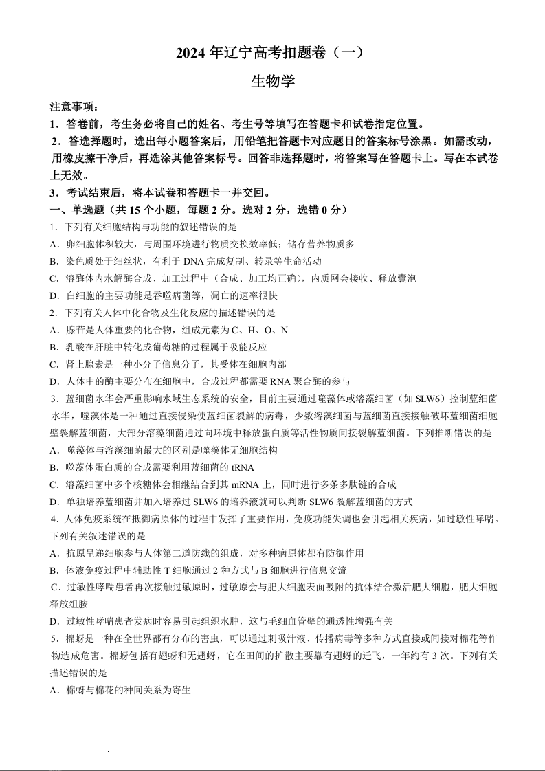 2024届辽宁省高三下学期高考扣题(一)生物+答案