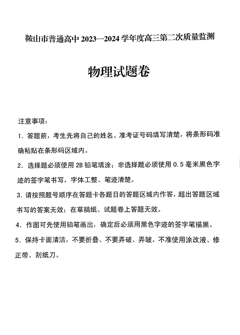 辽宁省鞍山市普通高中2024届高三下学期第二次质量监测物理+答案