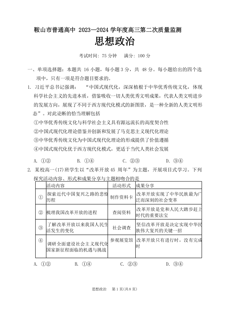 辽宁省鞍山市普通高中2024届高三下学期第二次质量监测政治