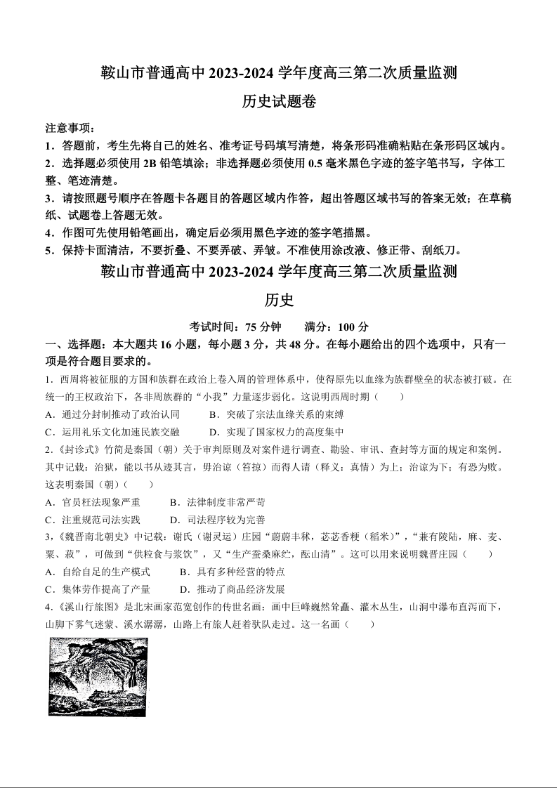 辽宁省鞍山市普通高中2024届高三下学期第二次质量监测历史+答案