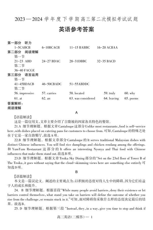 辽宁省重点高中协作校2023 - 2024学年度下学期高三第二次模拟考试英语答案