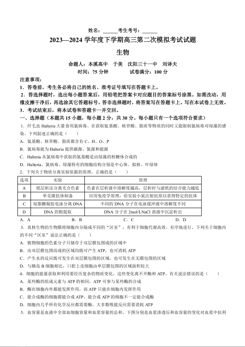 辽宁省重点高中协作校2023 - 2024学年度下学期高三第二次模拟考试生物+答案