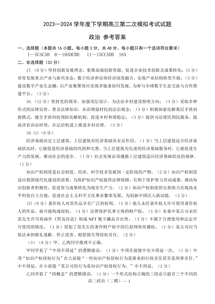 辽宁省重点高中协作校2023 - 2024学年度下学期高三第二次模拟考试政治答案