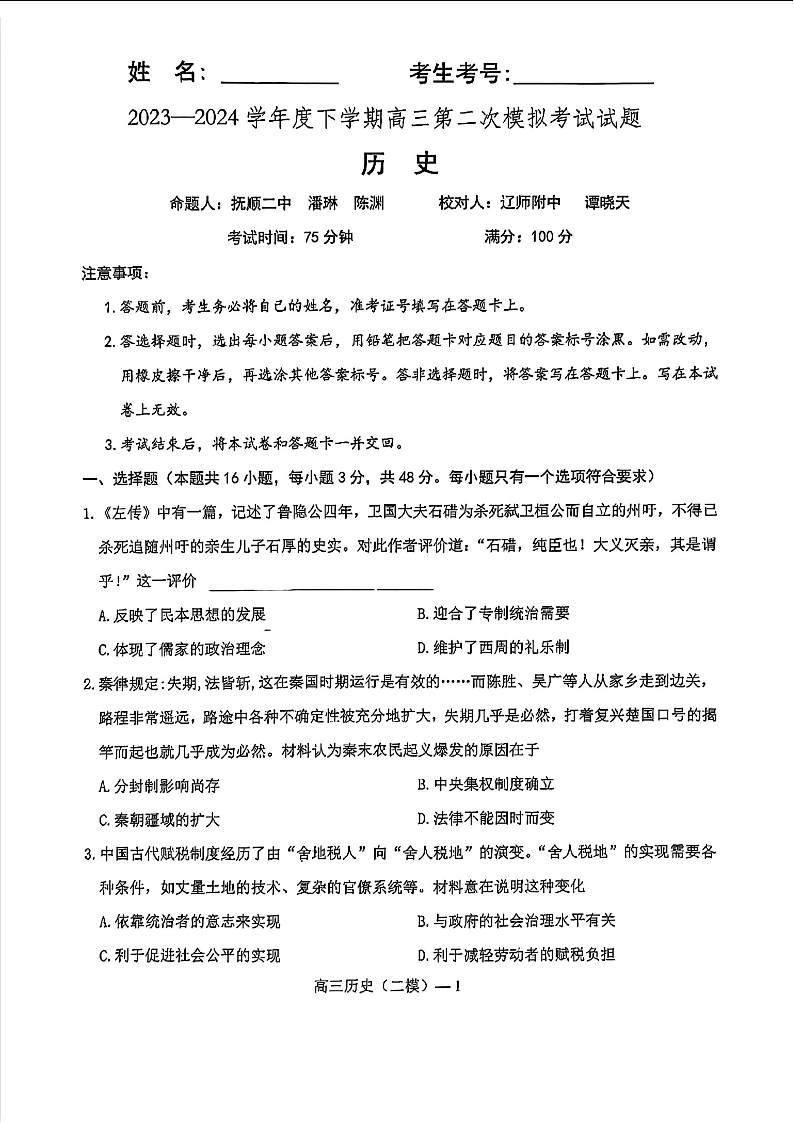 辽宁省重点高中协作校2023 - 2024学年度下学期高三第二次模拟考试历史+答案