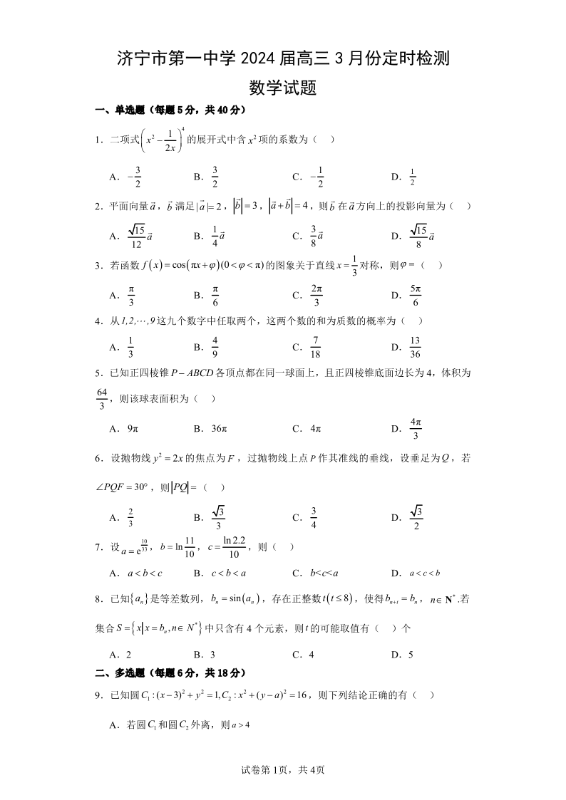 山东省济宁市第一中学2024届高三下学期3月月考数学+答案