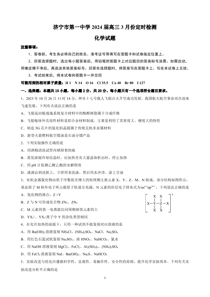 山东省济宁市第一中学2024届高三下学期3月月考化学+答案