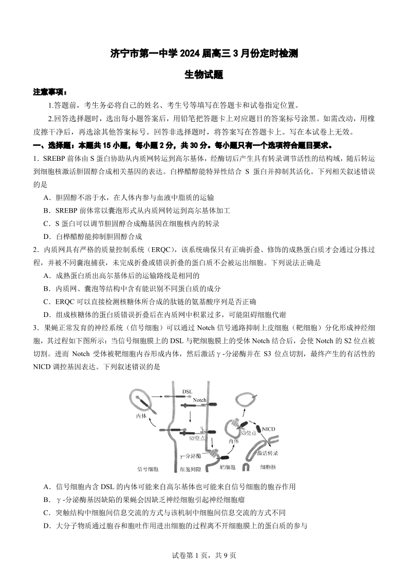 山东省济宁市第一中学2024届高三下学期3月月考生物+答案