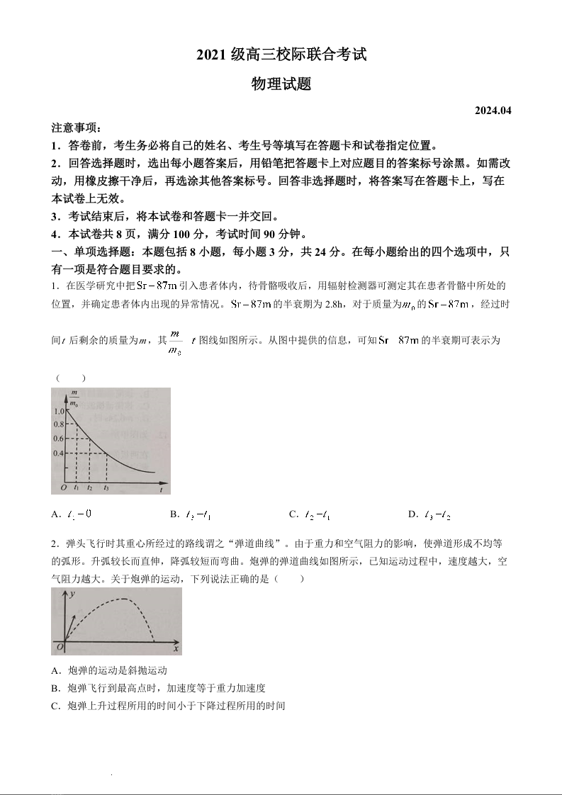 山东省日照市2024届高三下学期4月校际联合考试(日照二模)物理