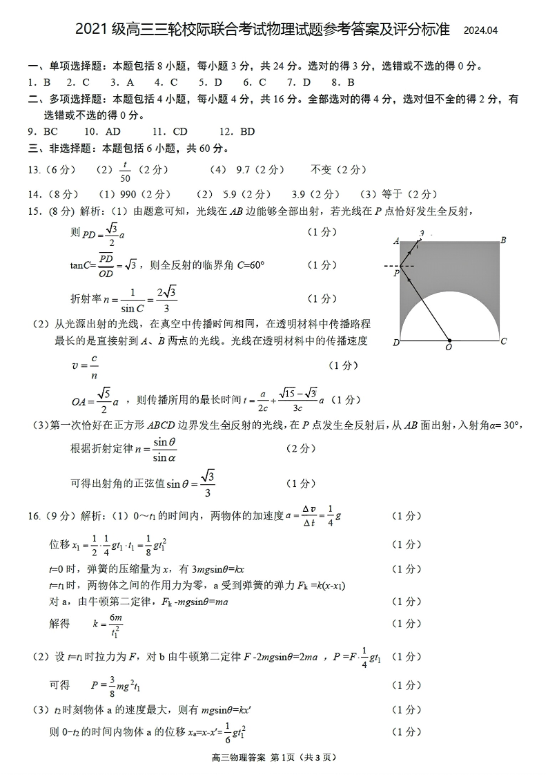 山东省日照市2024届高三下学期4月校际联合考试(日照二模)物理答案