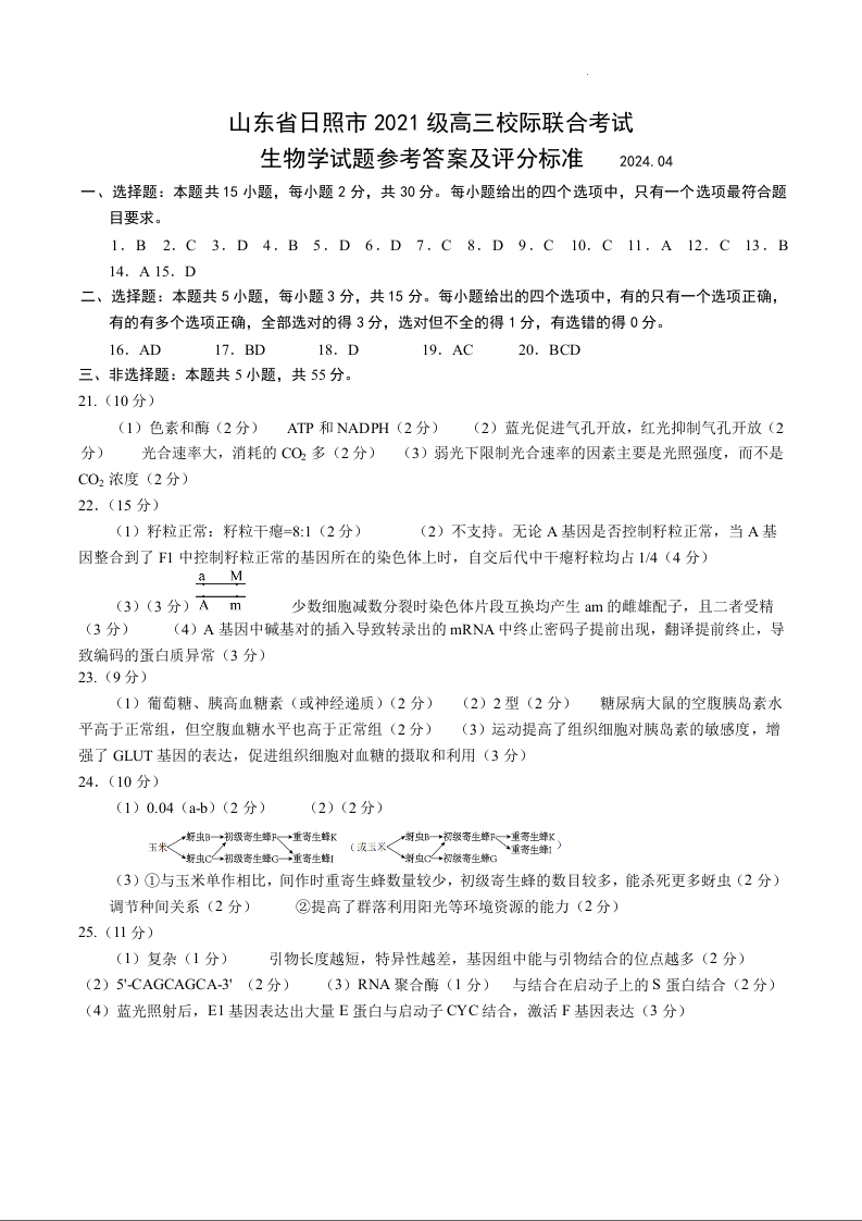 山东省日照市2024届高三下学期4月校际联合考试(日照二模)生物答案
