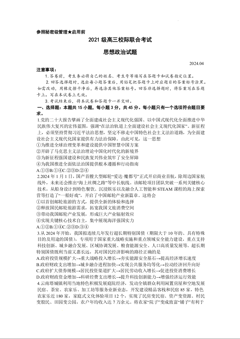 山东省日照市2024届高三下学期4月校际联合考试(日照二模)政治