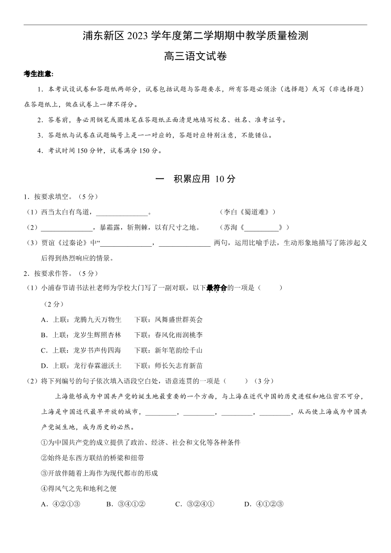 上海市浦东新区2024届高三二模语文