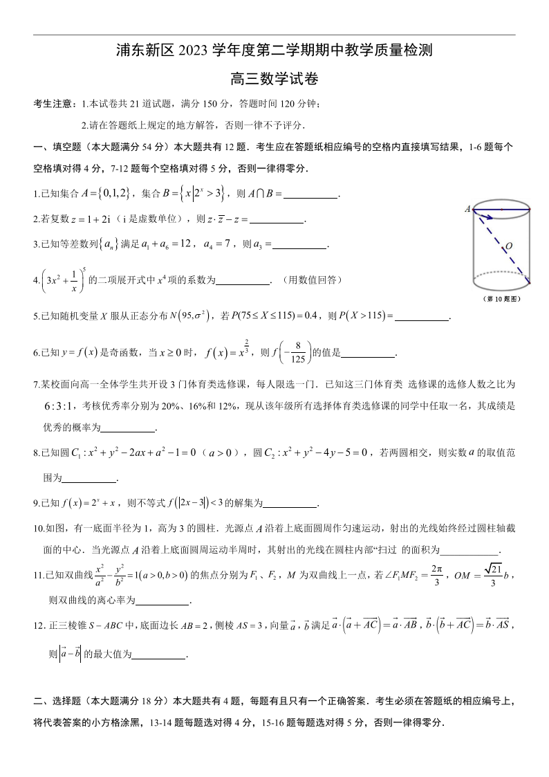 上海市浦东新区2024届高三二模数学