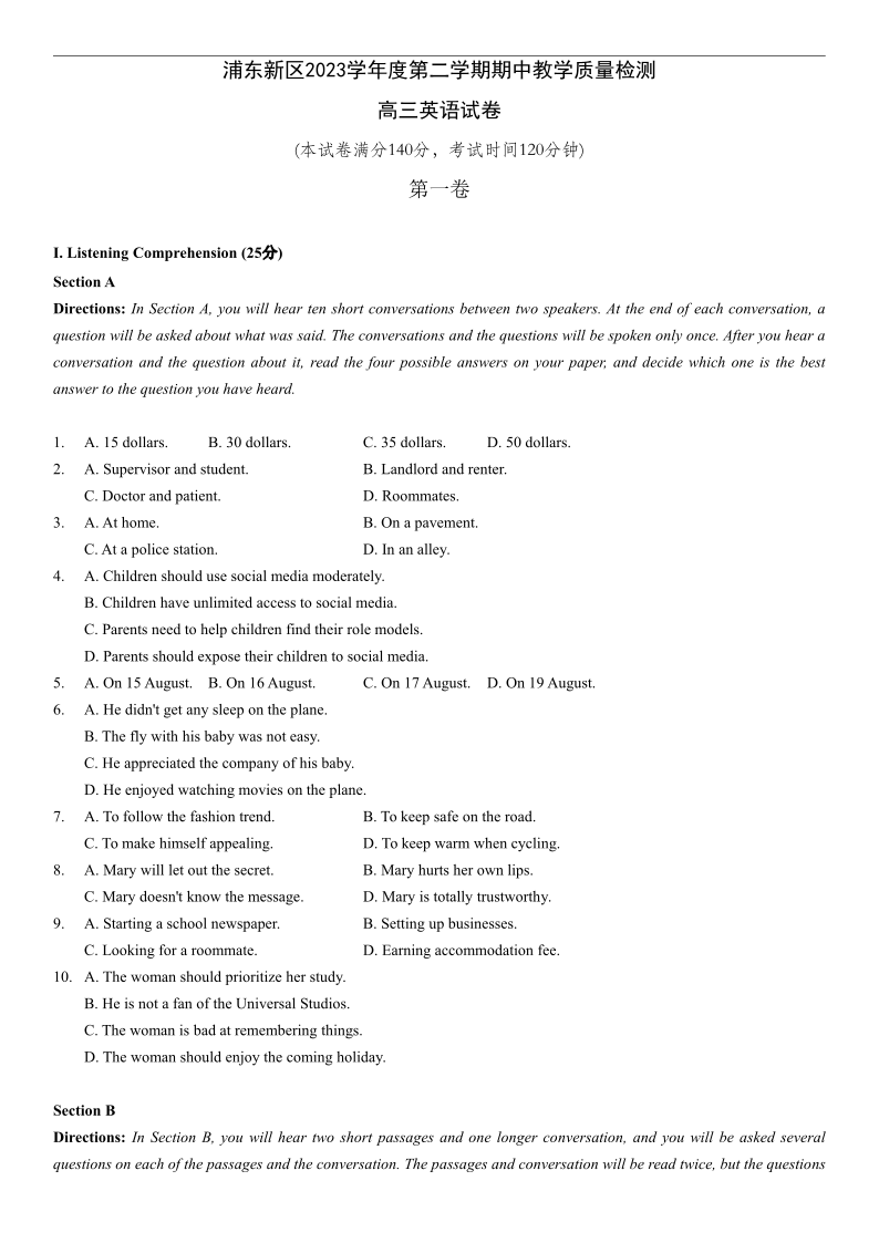 上海市浦东新区2024届高三二模英语
