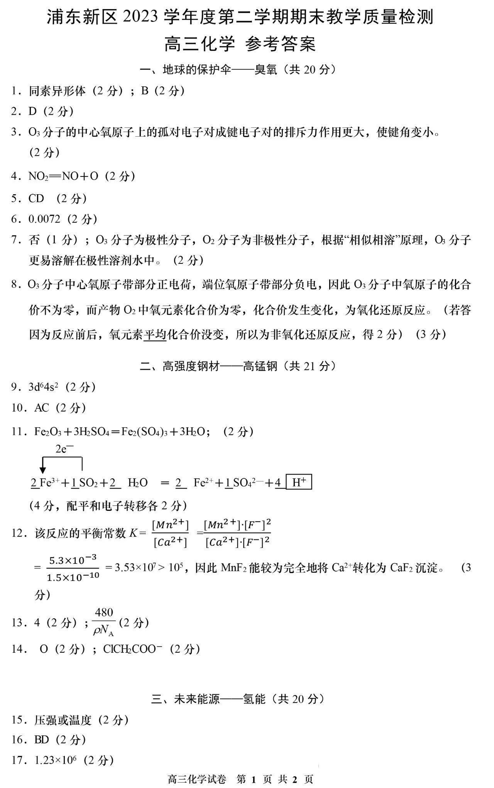 上海市浦东新区2024届高三二模化学答案
