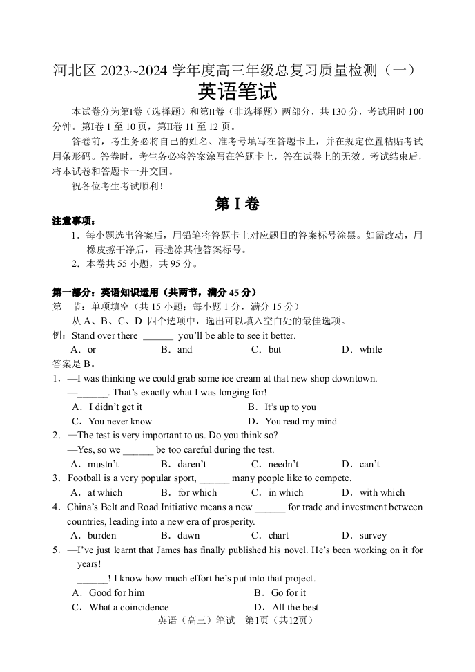 天津市河北区2024届高三下学期总复习质量检测(一)英语