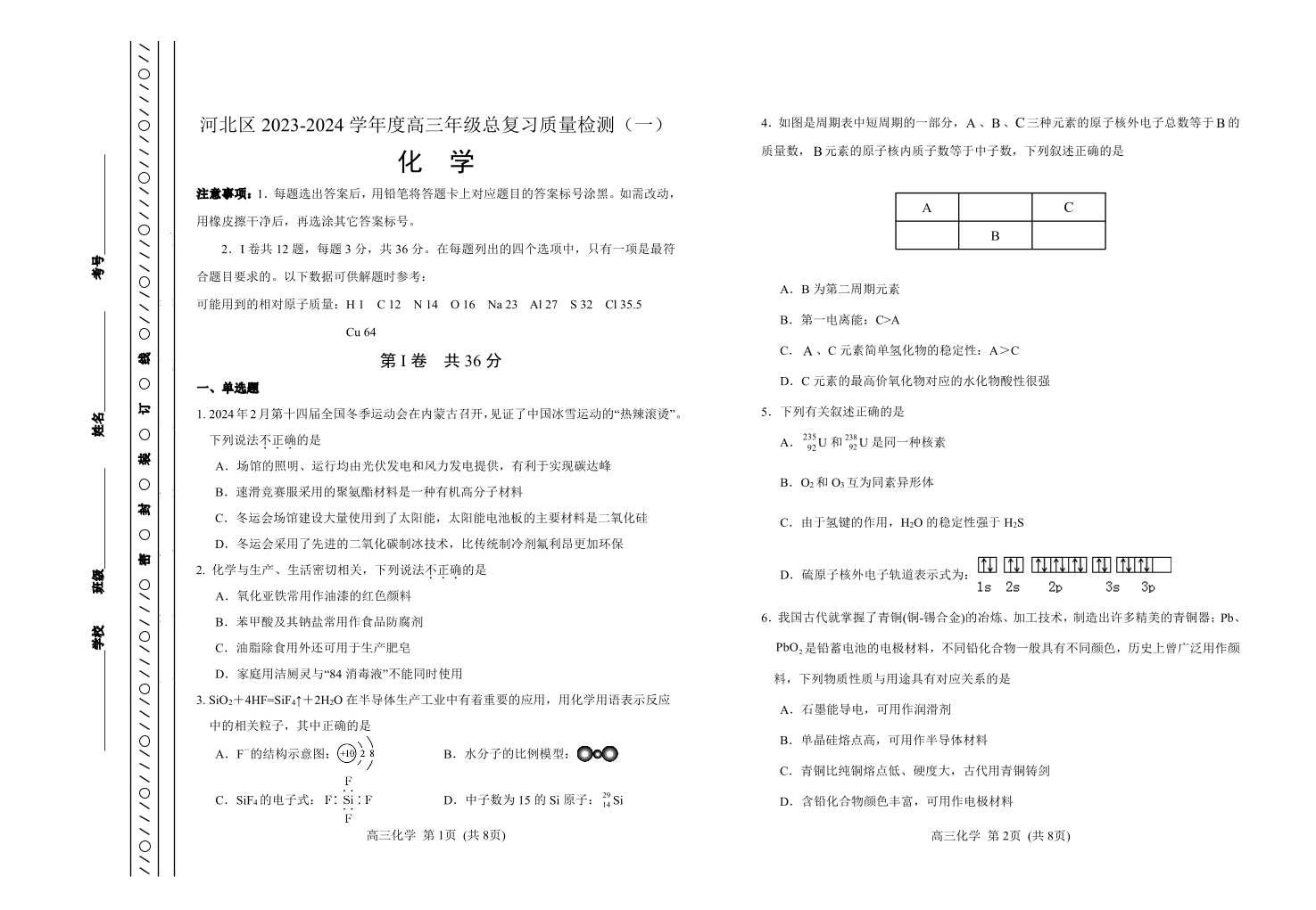 天津市河北区2024届高三下学期总复习质量检测(一)化学