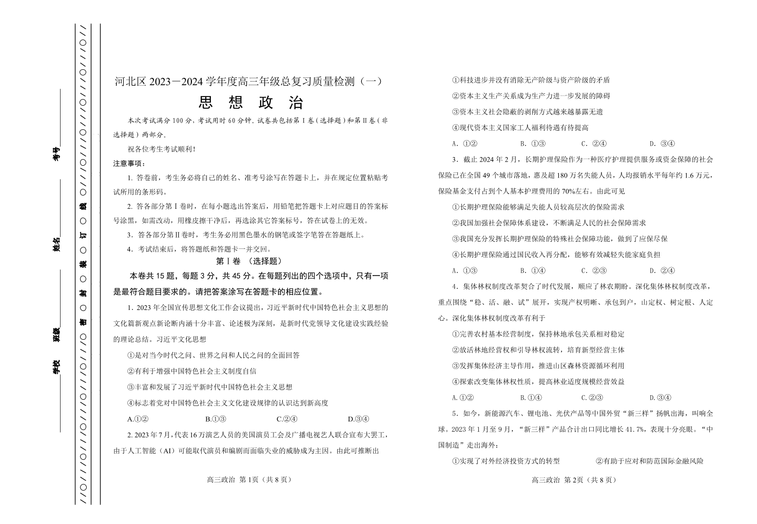天津市河北区2024届高三下学期总复习质量检测(一)政治