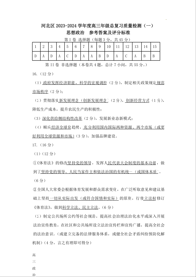 天津市河北区2024届高三下学期总复习质量检测(一)政治答案
