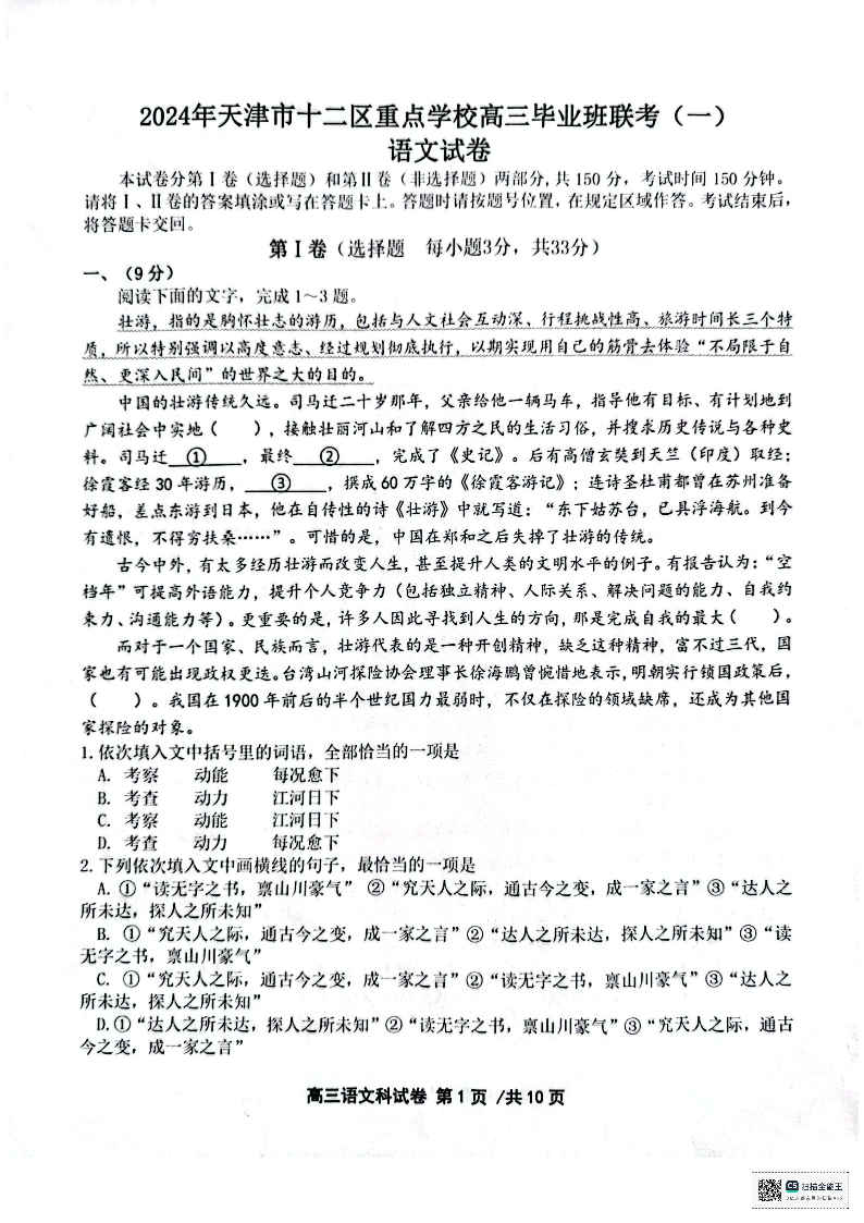 天津市十二区县重点校2024届高三下学期第一次模拟考试语文+答案