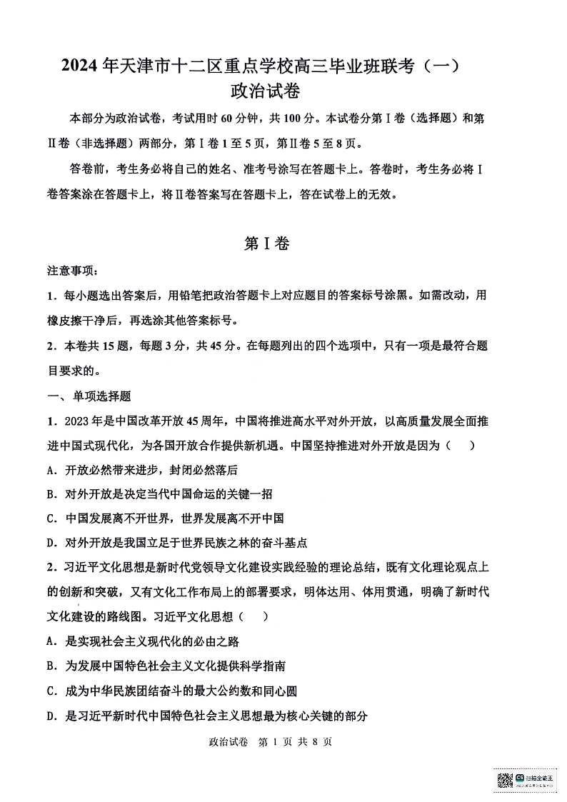 天津市十二区县重点校2024届高三下学期第一次模拟考试政治+答案