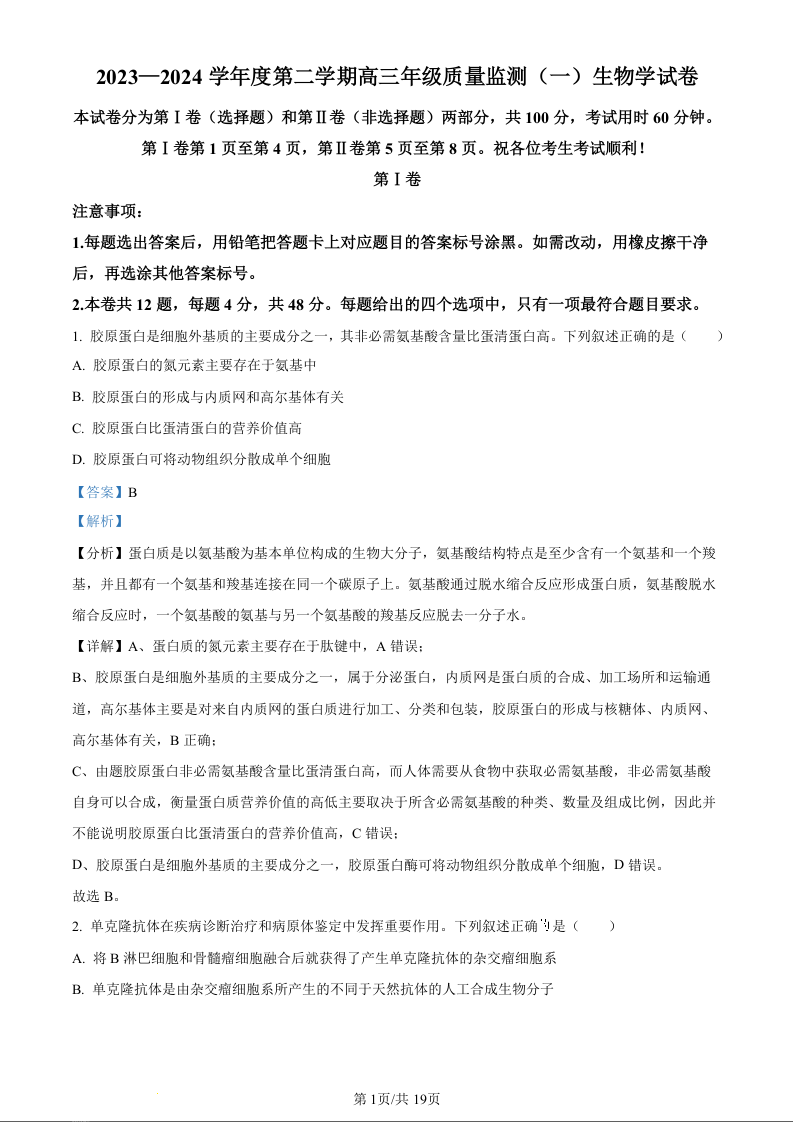 天津市南开区2024届高三下学期一模生物(精品解析版)