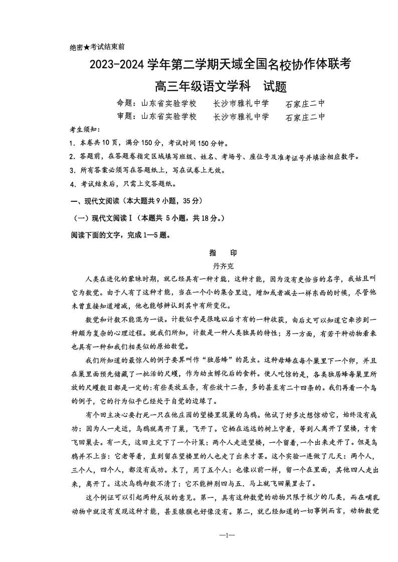 天域全国名校协作体2024届高三下学期4月联考语文