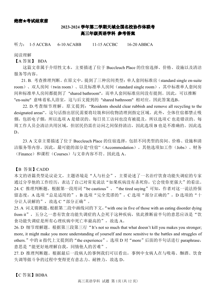天域全国名校协作体2024届高三下学期4月联考英语答案