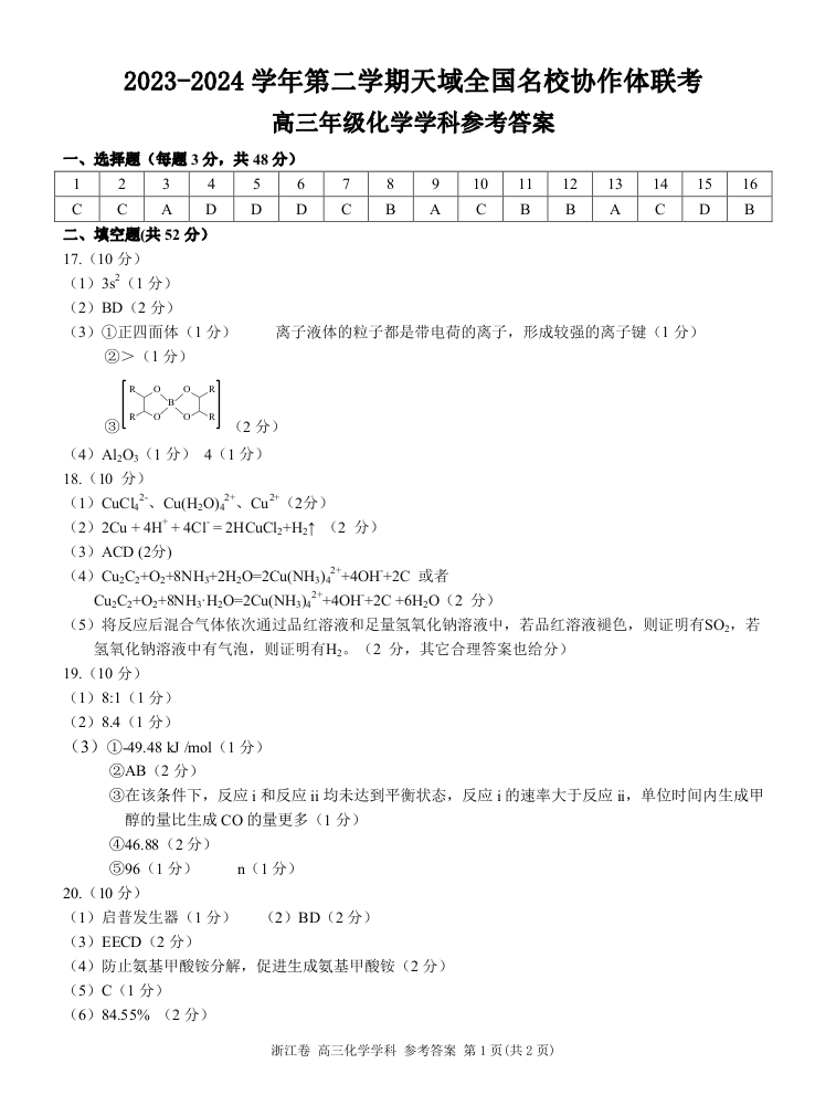 天域全国名校协作体2024届高三下学期4月联考化学答案