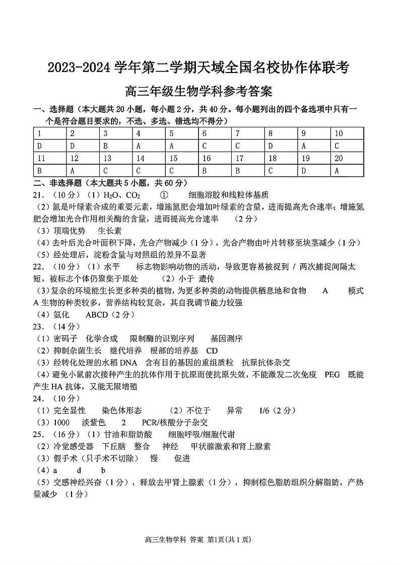 天域全国名校协作体2024届高三下学期4月联考生物答案