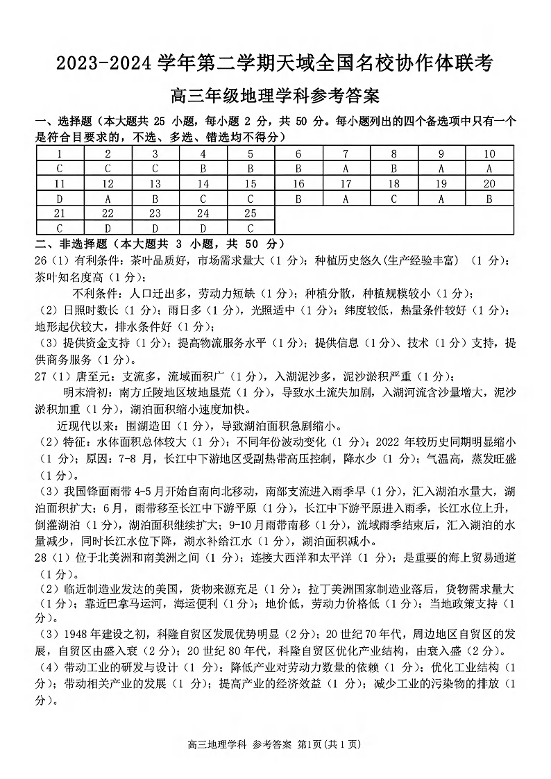 天域全国名校协作体2024届高三下学期4月联考地理答案