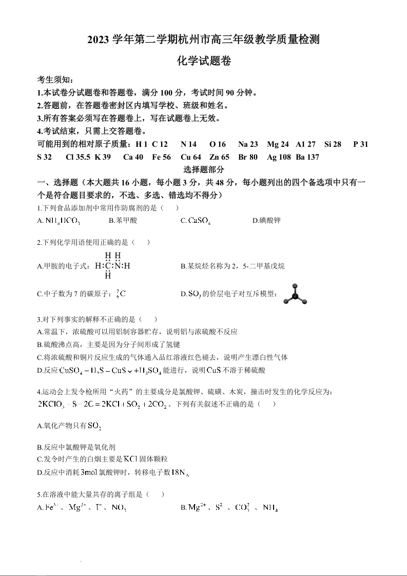 浙江省杭州市2024届高三年级教学质量检测(杭州二模)化学+答案
