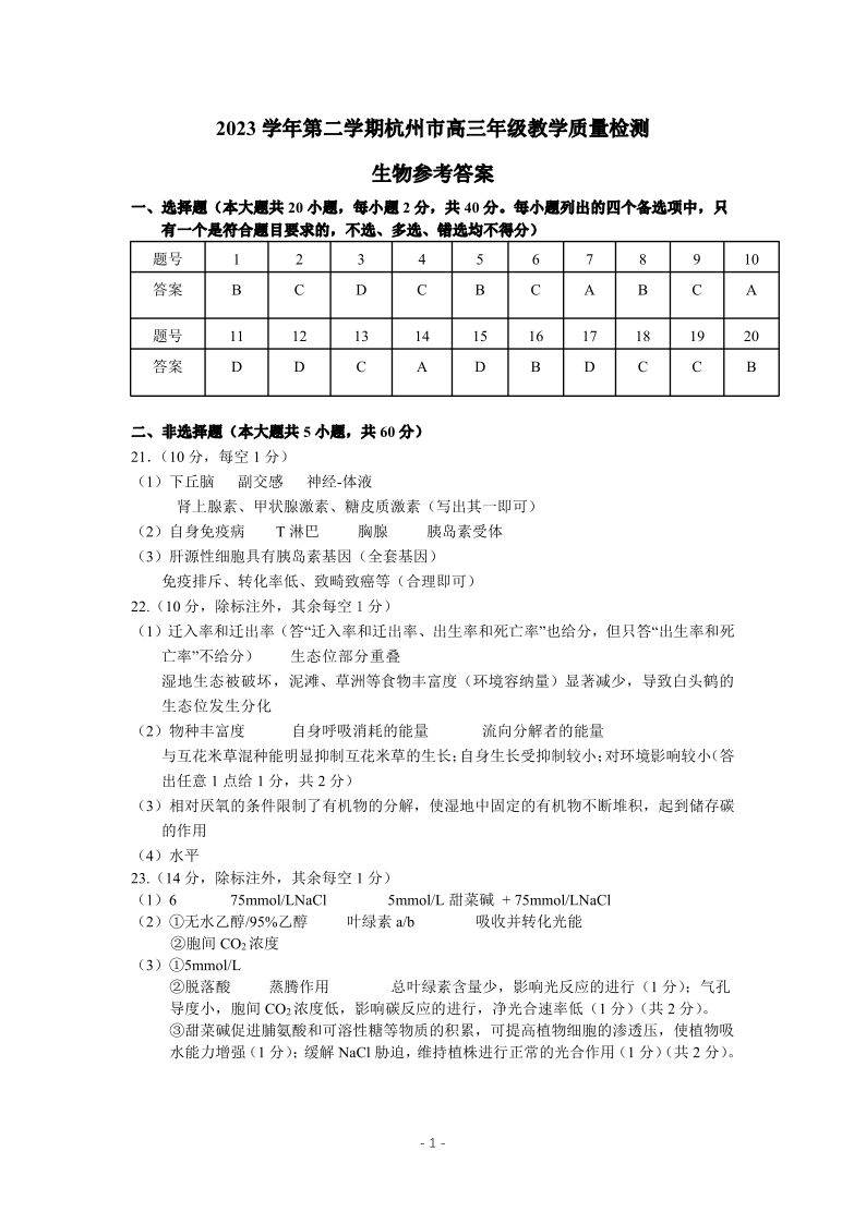 浙江省杭州市2024届高三年级教学质量检测(杭州二模)生物答案