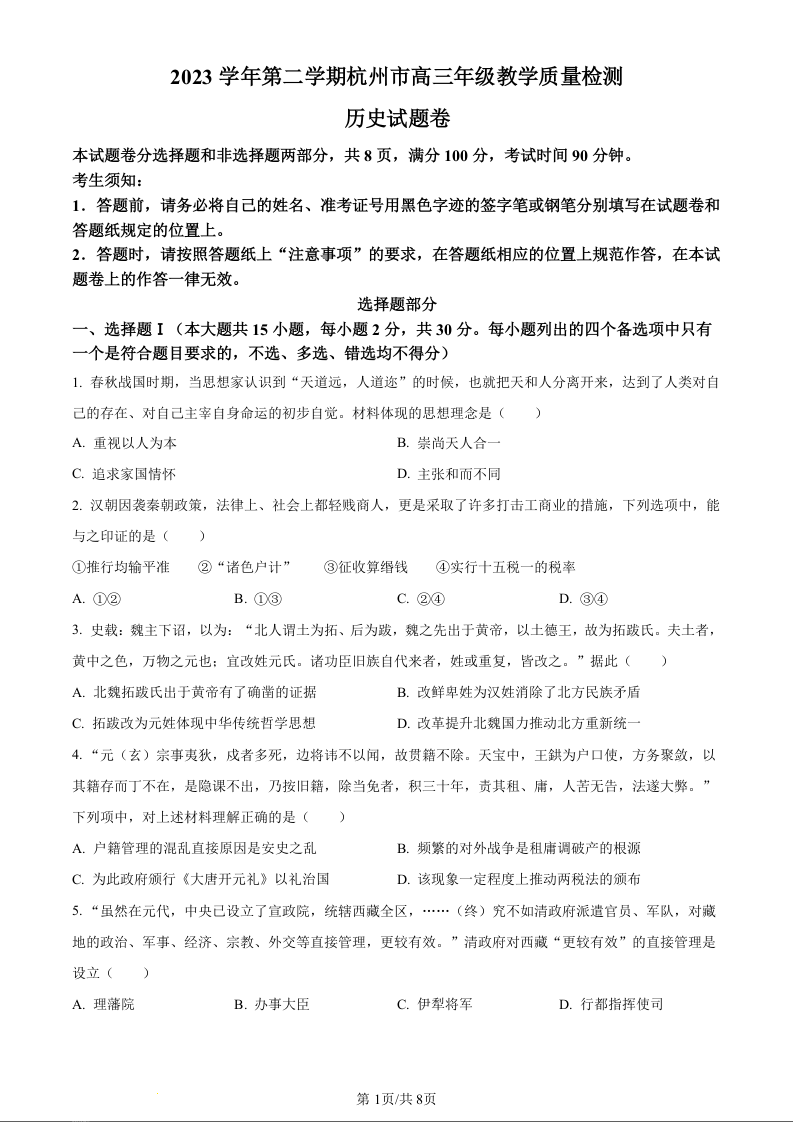 浙江省杭州市2024届高三年级教学质量检测(杭州二模)历史(原卷版)