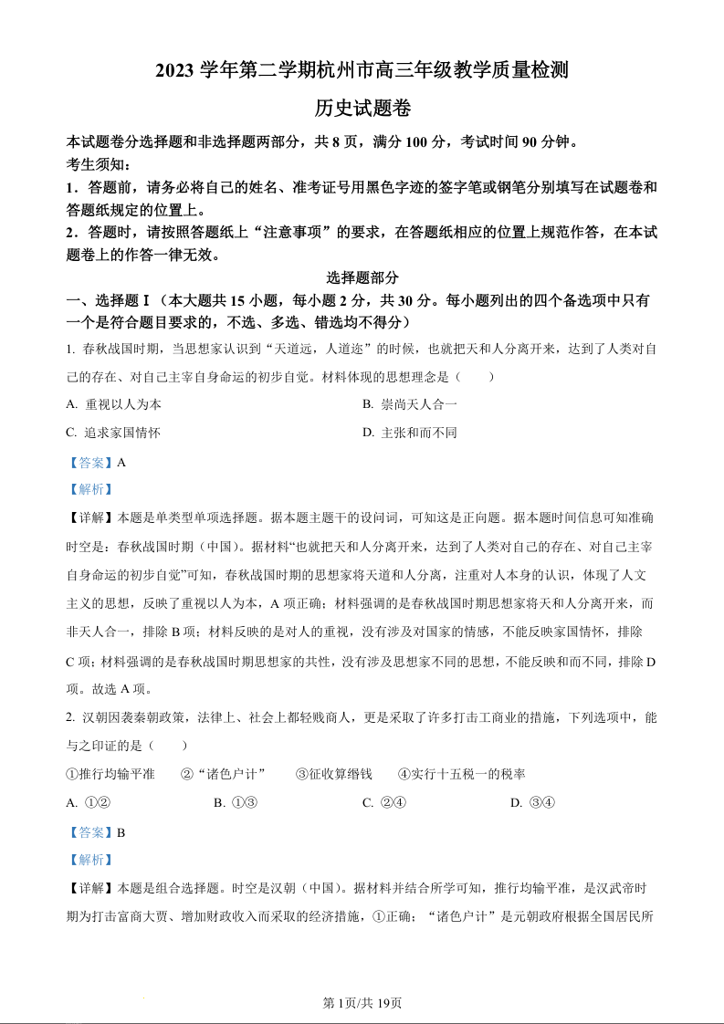 浙江省杭州市2024届高三年级教学质量检测(杭州二模)历史(精品解析版)