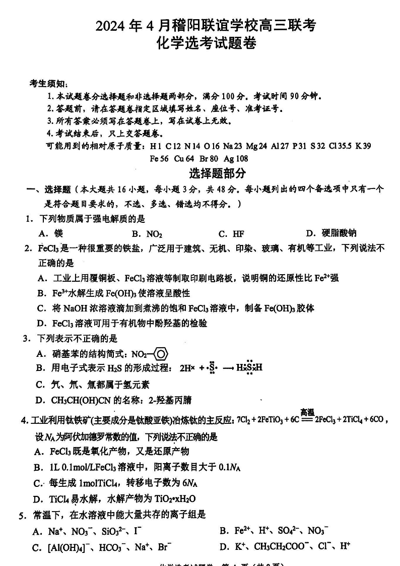 浙江省稽阳联谊学校2024届高三下学期4月联考试题(二模)化学