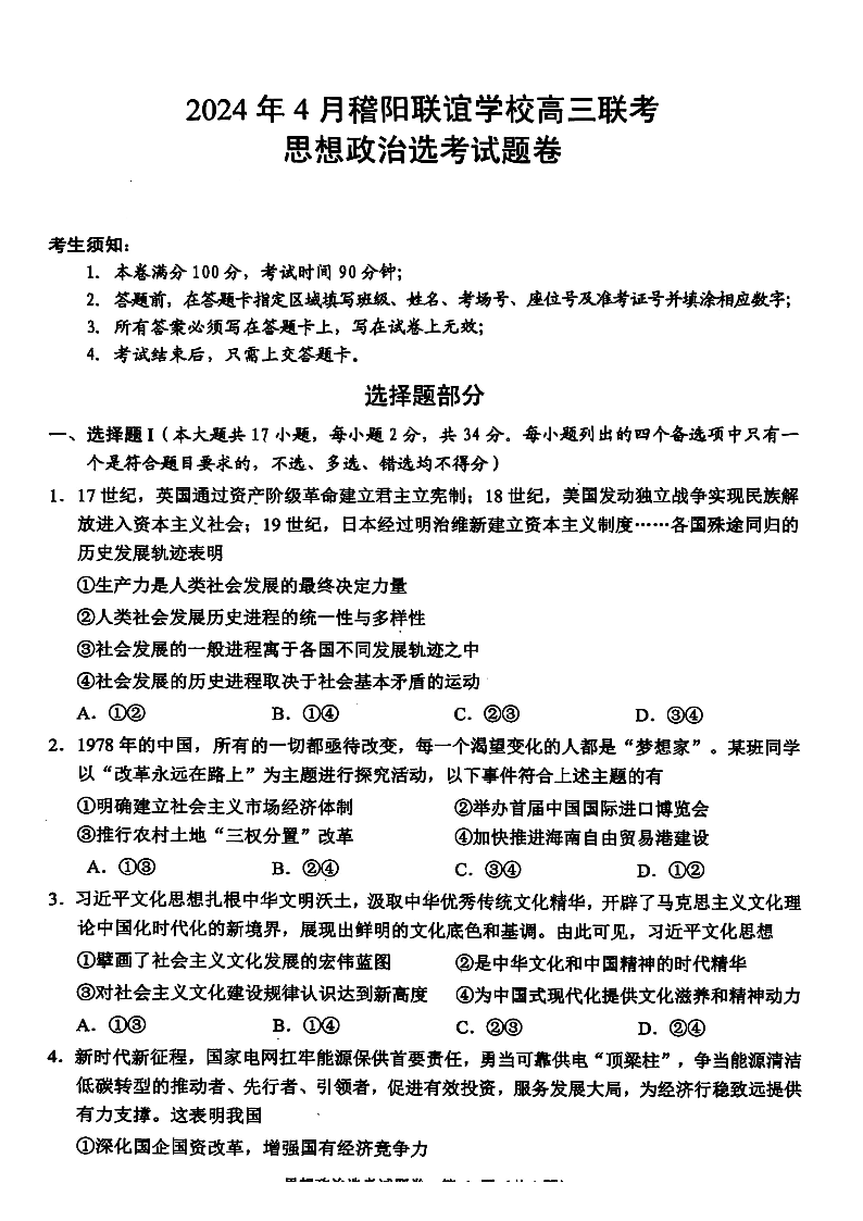 浙江省稽阳联谊学校2024届高三下学期4月联考试题(二模)政治
