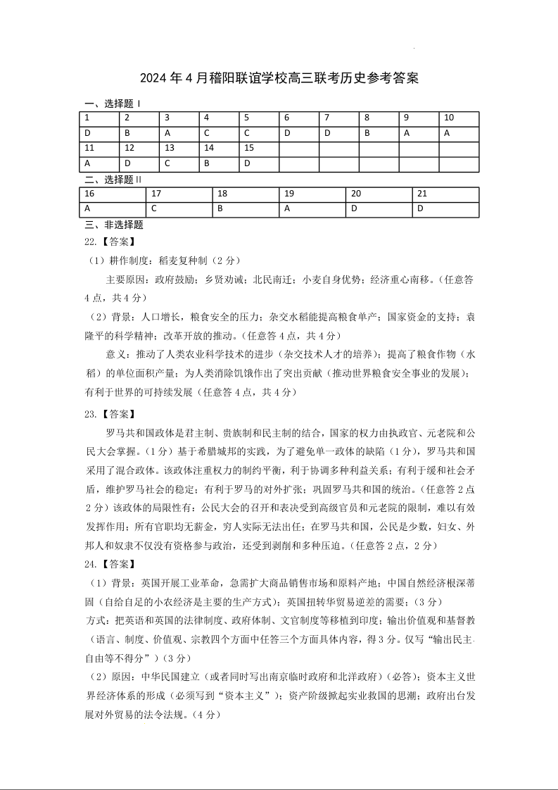 浙江省稽阳联谊学校2024届高三下学期4月联考试题(二模)历史答案