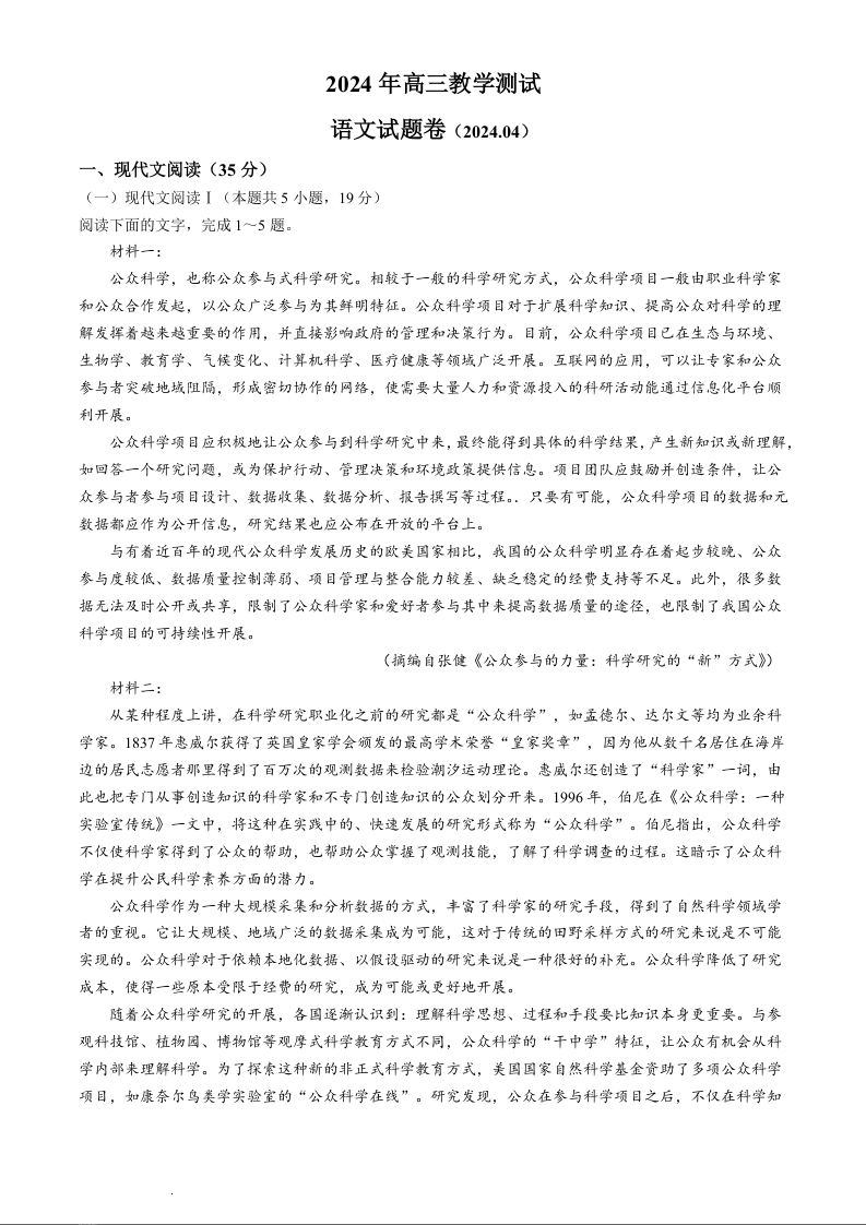 浙江省嘉兴市2024届高三下学期二模语文+答案