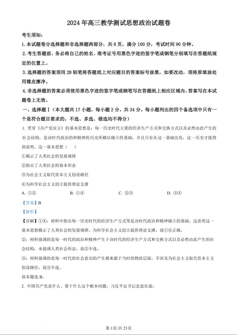 浙江省嘉兴市2024届高三下学期二模政治(精品解析版)