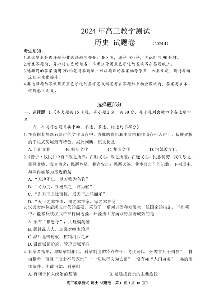 浙江省嘉兴市2024届高三下学期二模历史+答案