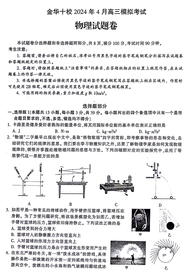 浙江省金华十校2024届高三下学期4月模拟考试(二模)物理
