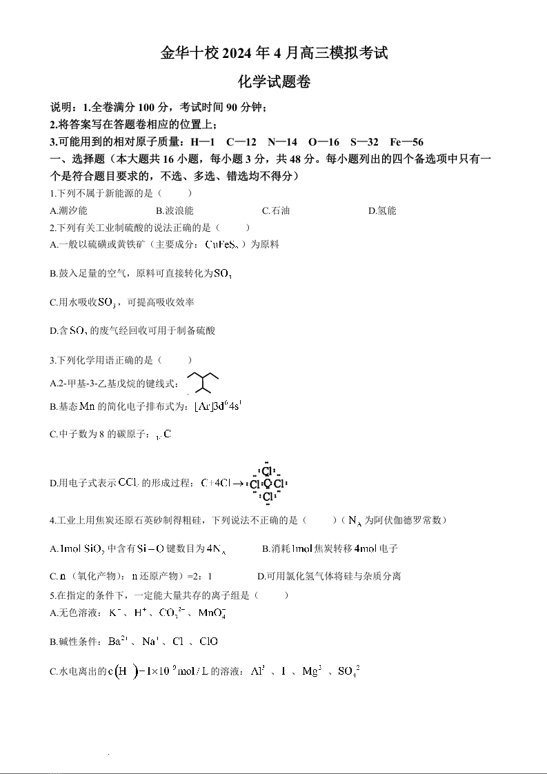浙江省金华十校2024届高三下学期4月模拟考试(二模)化学+答案