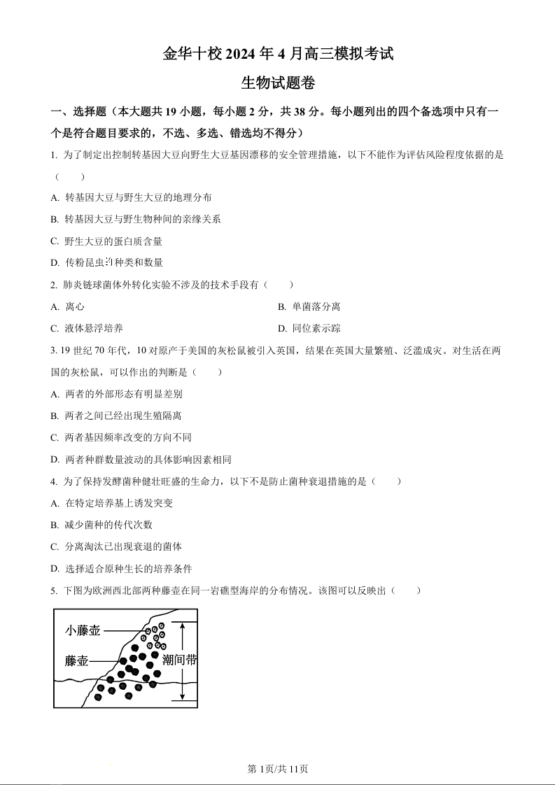 浙江省金华十校2024届高三下学期4月模拟考试(二模)生物(原卷版)