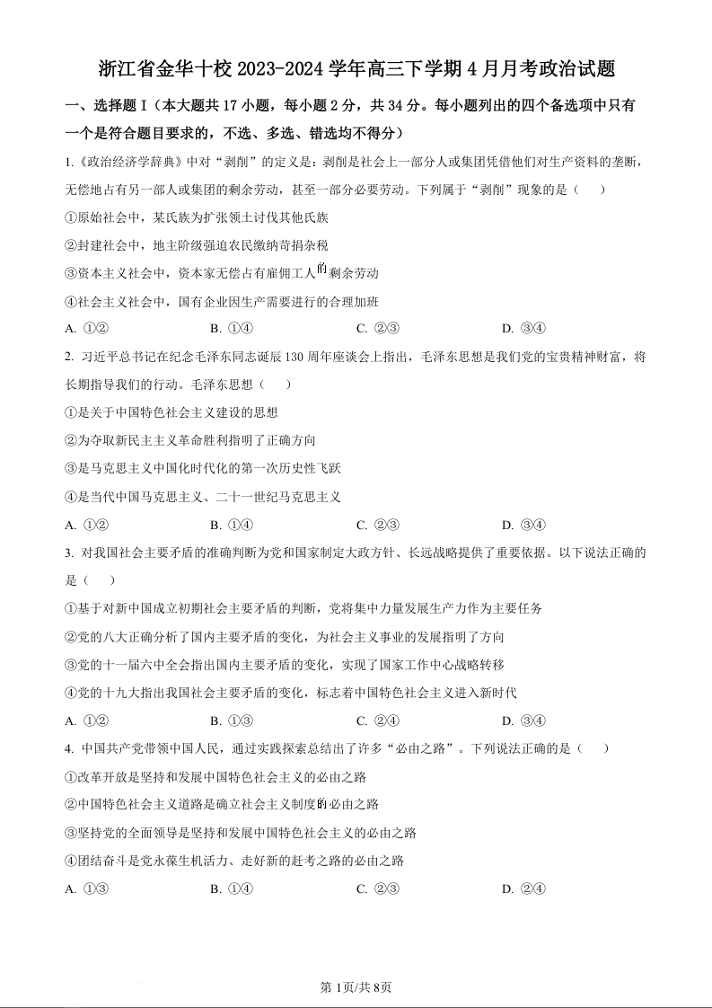 浙江省金华十校2024届高三下学期4月模拟考试(二模)政治(原卷版)