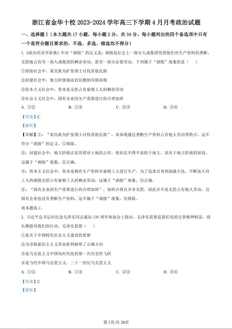 浙江省金华十校2024届高三下学期4月模拟考试(二模)政治(精品解析版)