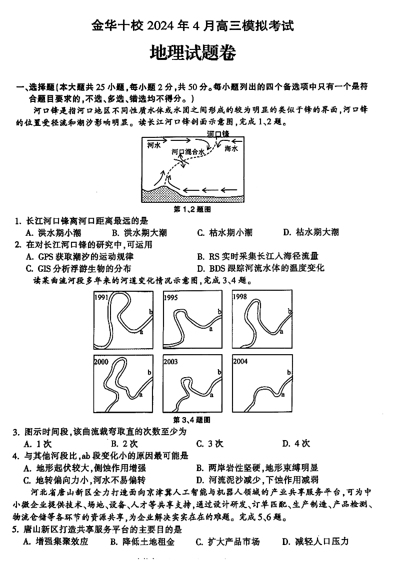 浙江省金华十校2024届高三下学期4月模拟考试(二模)地理+答案