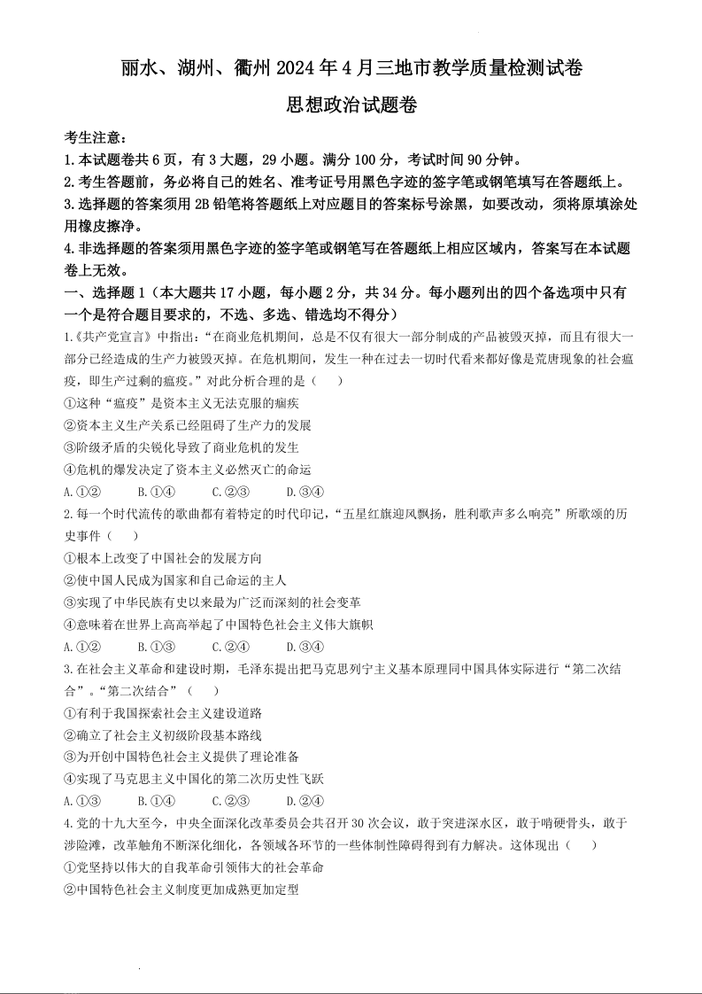 浙江省丽水、湖州、衢州三地市2024届高三下学期4月二模政治+答案