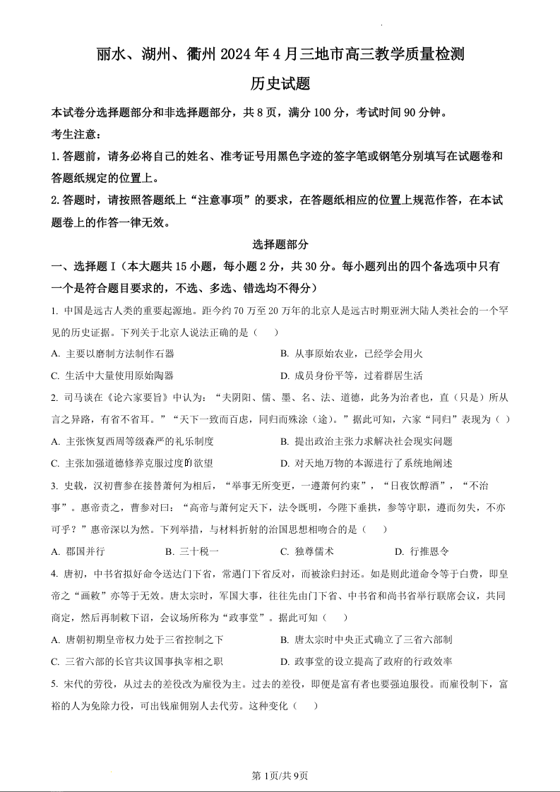 浙江省丽水、湖州、衢州三地市2024届高三下学期4月二模历史(原卷版)