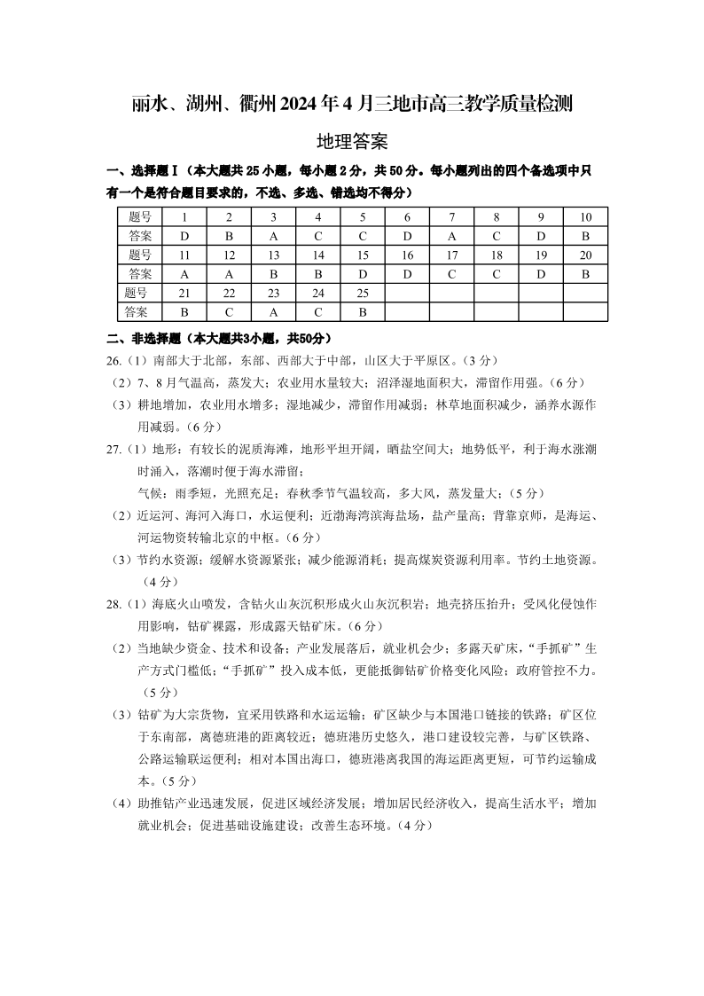 浙江省丽水、湖州、衢州三地市2024届高三下学期4月二模地理答案